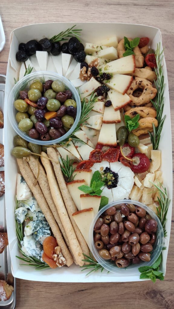 A jeśli nie masz możliwości przynieść jej wcześniej – nic straconego! Nasze deski standardowo przygotowujemy na estetycznej folii i pakujemy w kartonowe pudełko, które rozklada się z czterech stron – dokładnie jak pudełko cukiernicze. Dzięki temu możesz w kilka sekund łatwo przesunąć całą zawartość na własne naczynie, deskę lub półmisek, zachowując całą kompozycję i wygląd bez żadnego bałaganu.