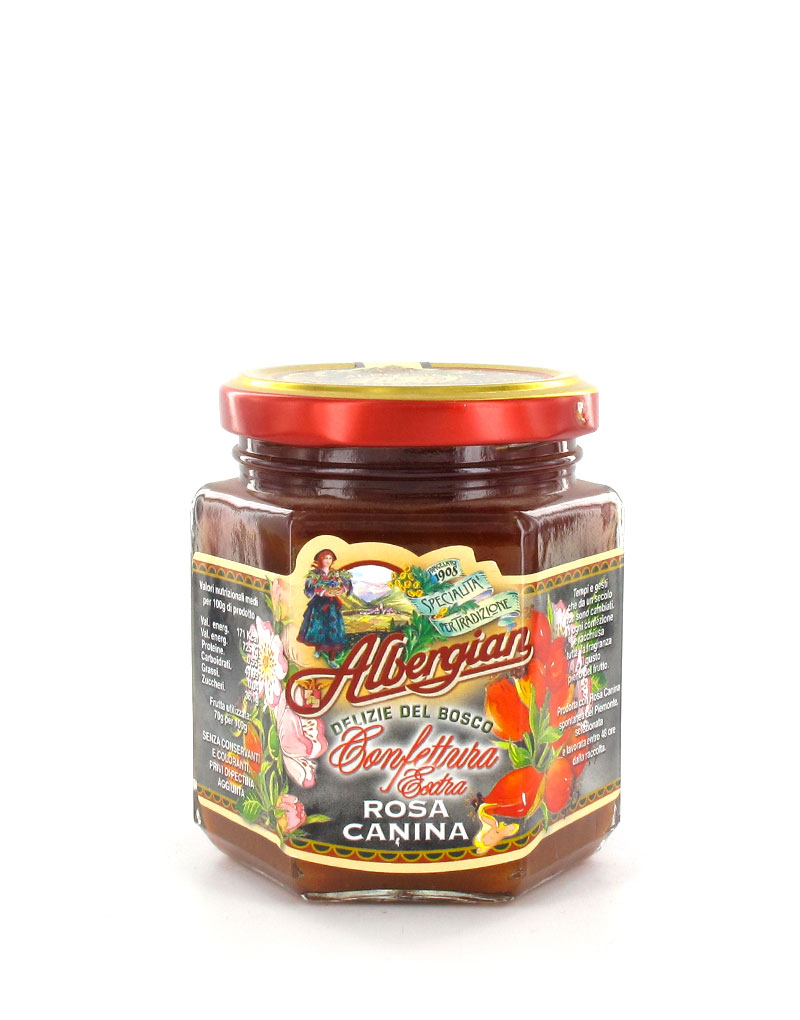 Konfitury Albergian powstają z wysokiej jakości włoskich owoców, zachowując naturalny smak i aromat dzikiej róży dojrzewającej w słońcu.