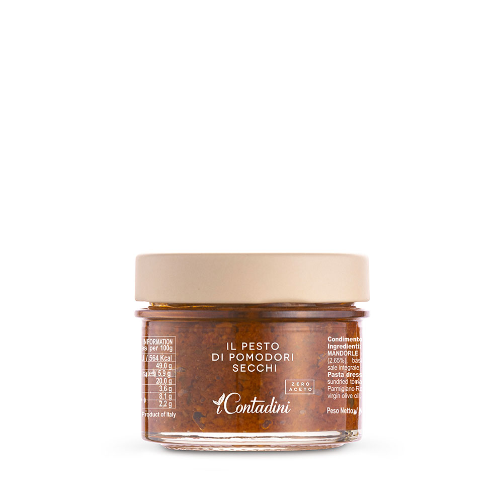 Pesto di Pomodori Secchi I Contadini 100g to autentyczne włoskie pesto z suszonych pomidorów, migdałów i Parmigiano Reggiano. Intensywny, głęboki smak bez dodatku octu idealnie podkreśla dania kuchni śródziemnomorskiej.