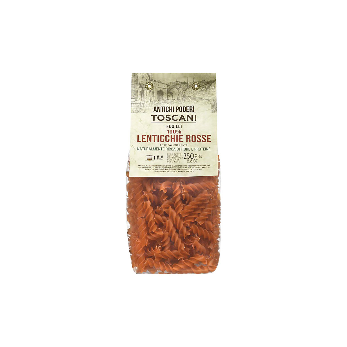 Antichi Poderi Toscani Fusilli Lenticchie Rosse 250g to makaron z czerwonej soczewicy, bogaty w białko i błonnik. Naturalny, bezglutenowy i pełen koloru – zdrowa alternatywa dla klasycznej pasty.