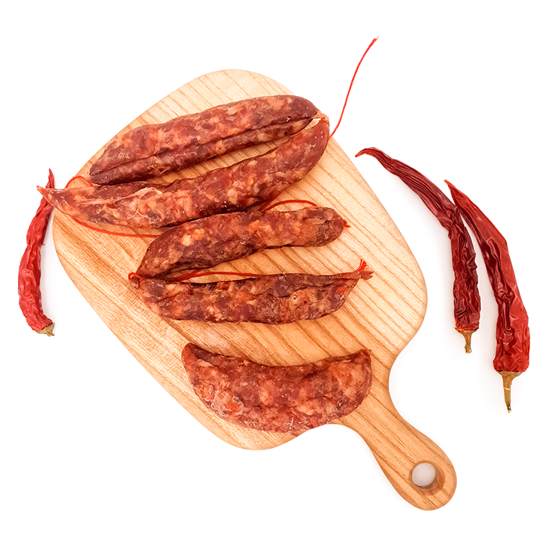 Kiełbaski Abruzzese Piccante to tradycyjne pikantne kiełbaski z regionu Abruzji, przygotowywane z najwyższej jakości mięsa wieprzowego i aromatycznych przypraw, w tym papryczki chili. Charakteryzują się intensywnym, wyrazistym smakiem i delikatną ostrością, idealnym na deski wędlin, do grillowania lub jako dodatek do makaronów i dań z pieca.