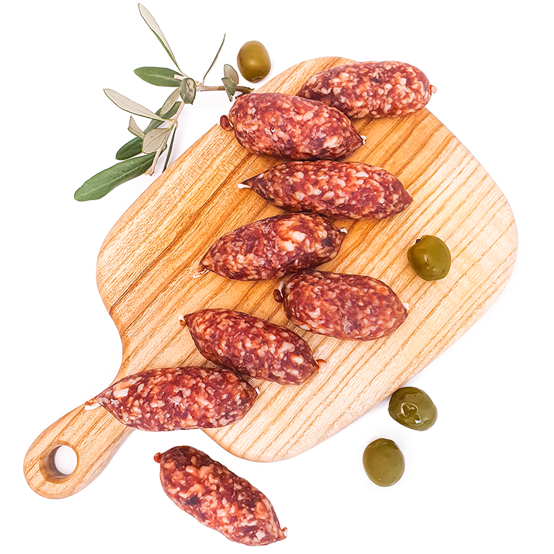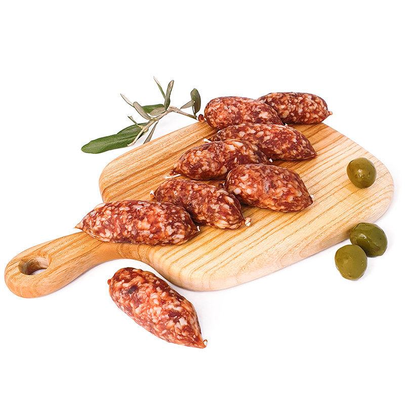 Kiełbaski Bocconcini Dolci to łagodne włoskie mini kiełbaski o subtelnym, delikatnym smaku, przygotowywane z wysokiej jakości mięsa wieprzowego i delikatnych przypraw. Charakteryzują się aksamitną konsystencją i łagodnym aromatem, idealnym na deski wędlin, do kanapek lub jako przekąska na przyjęcia.