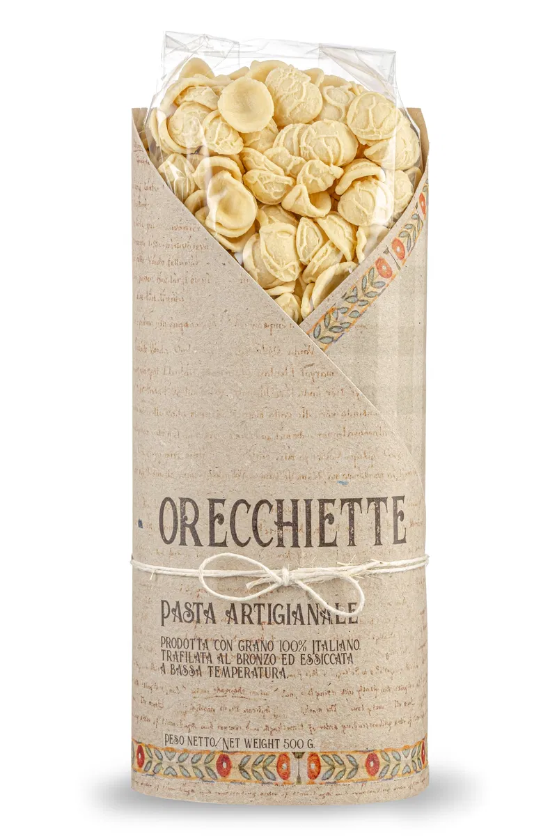 Artigiani del Sapori Orecchiette to jeden z najbardziej rozpoznawalnych makaronów z południa Włoch, pochodzący z regionu Apulii. Jego charakterystyczny kształt „uszek” idealnie zatrzymuje sosy i warzywa, tworząc harmonijne, kremowe dania pełne smaku.