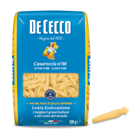 De Cecco Casareccia to krótkie, skręcone rurki makaronu o charakterystycznym kształcie, który przypomina ręcznie robione makarony domowe. Rowkowana i skręcona powierzchnia sprawia, że sosy idealnie przylegają do każdej rurki, podkreślając smak potrawy. Doskonałe do sosów pomidorowych, kremowych, mięsnych i warzywnych, a także do pieczonych zapiekanek. Casareccia De Cecco to makaron, który pozwala poczuć autentyczny, domowy włoski klimat w każdym daniu.