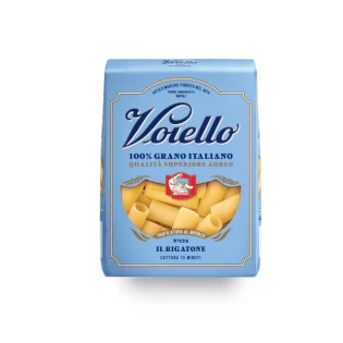 Voiello La Mezza Manica Rigata to krótsza, bardziej elegancka wersja klasycznego makaronu rigatoni, idealna do dań z intensywnymi sosami i pieczonych zapiekanek. Dzięki rowkowanej powierzchni i użyciu najwyższej jakości pszenicy Aureo, makaron ten oferuje perfekcyjną przyczepność sosu, sprężystą konsystencję i pełnię smaku. Jest idealnym wyborem dla miłośników klasyki w nowoczesnym wydaniu.