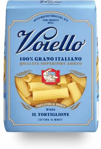 Voiello Tortiglione to premium włoski makaron ze złotej pszenicy Aureo o skręconym kształcie, który idealnie chłonie sosy. Klasyka z serca Neapolu.