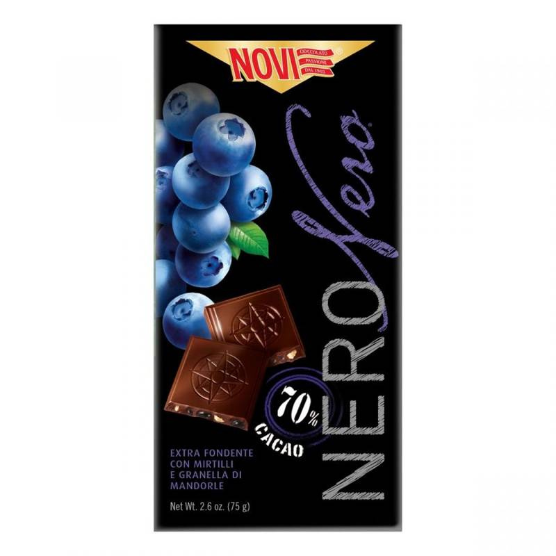 Novi Mirtillo 70% Nero Vero 75g to włoska gorzka czekolada z naturalnym aromatem jagód. Intensywna, aromatyczna i elegancka – idealna do degustacji solo lub z kawą. 🍫🇮🇹