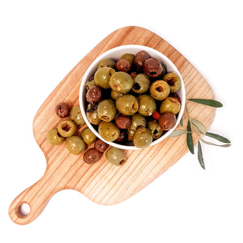 🧄 Skład: mix zielonych i czarnych oliwek z przyprawami