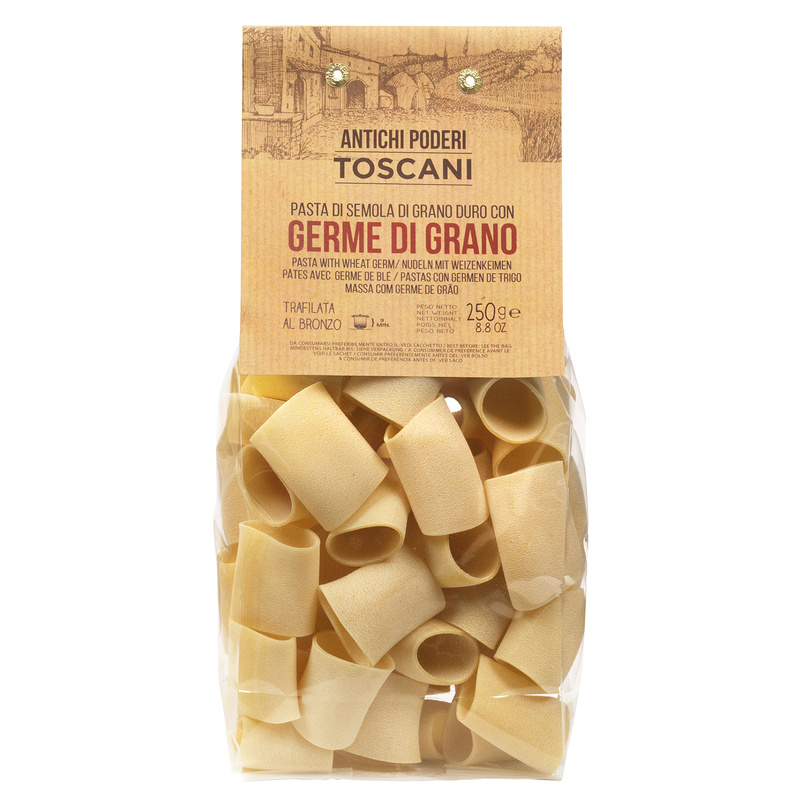Antichi Poderi Toscani Paccheri Germe di Grano 250g to makaron wzbogacony kiełkami pszenicy, o pełnym smaku i doskonałej strukturze. Idealny do gęstych sosów i zapiekanek – zdrowy, naturalny i w 100% włoski.