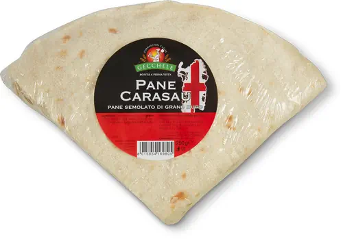 Gecchele Pane Carasau to tradycyjny chleb pochodzący z Sardynii, znany ze swojej niezwykłej lekkości i chrupkości. Wypiekany z prostych składników – mąki pszennej, wody, soli i drożdży – ma postać cienkich, złocistych płatów. Może być podawany jako przekąska, podstawa do antipasti lub zastępnik klasycznego pieczywa.