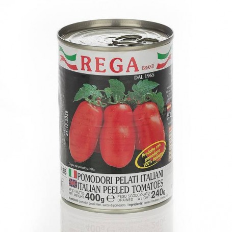 REGA Pomodori Pelati to klasyczne włoskie pomidory obrane, zamknięte w puszce tuż po zbiorach, aby zachować ich naturalny smak i aromat. Dojrzewające w słońcu południowych Włoch, pomidory REGA charakteryzują się intensywnym kolorem, soczystością i słodyczą. Idealne jako baza do sosów, zup, dań mięsnych i warzywnych.