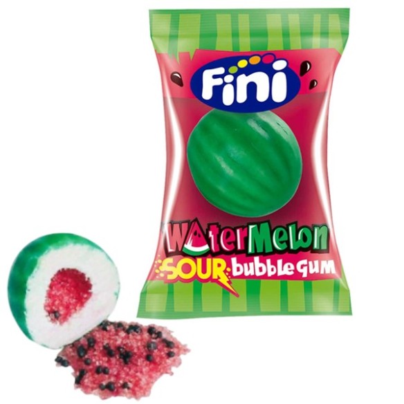 Fini Watermelon Sour Bubble Gum 1szt to arbuzowa guma balonowa z intensywnie kwaśnym, płynnym wnętrzem. Idealna dla miłośników słodko-kwaśnych smaków i dużych balonów. 🍉😋